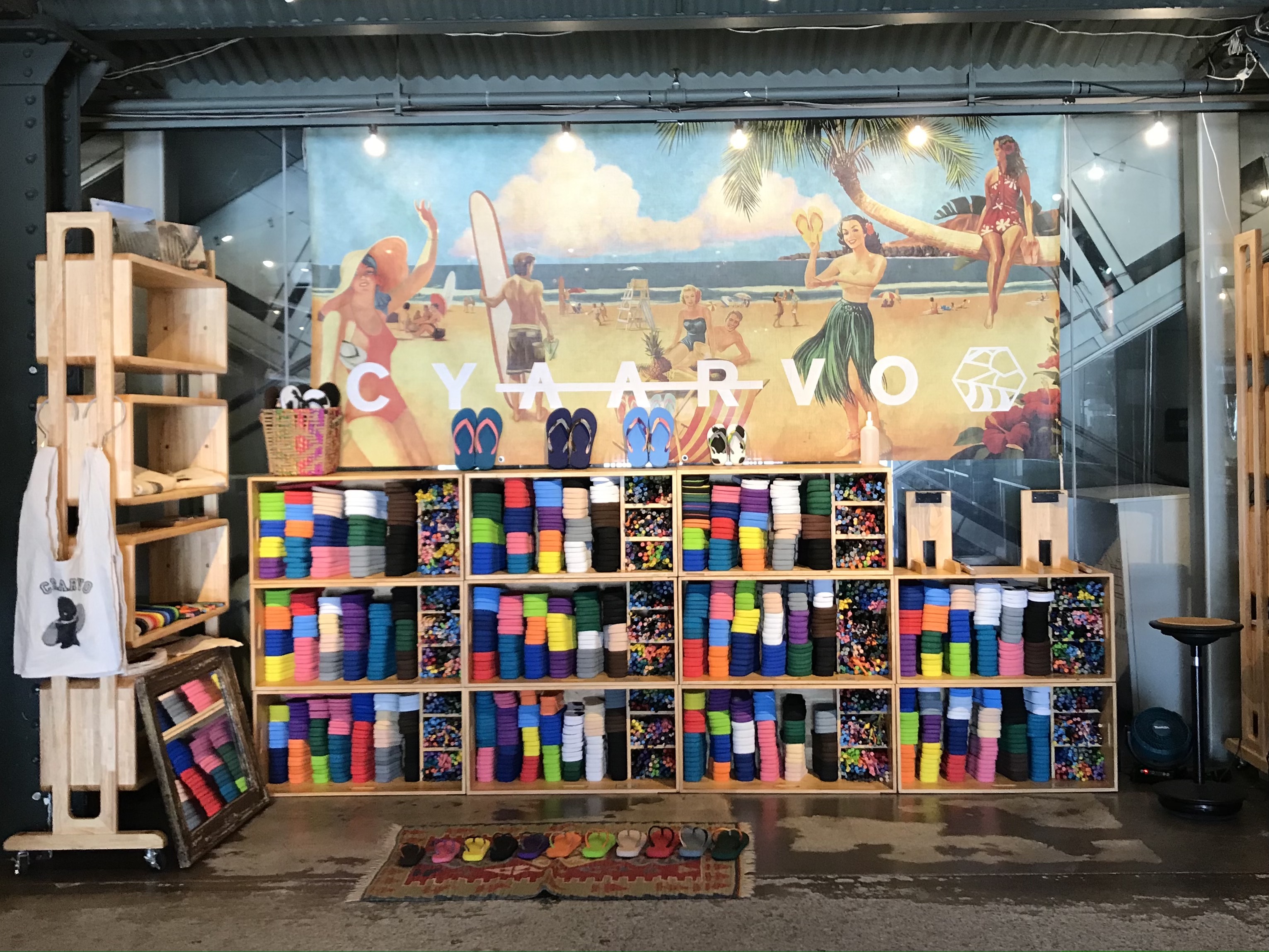 CYAARVOビーサンのパーツ(デッキ&トング)が色鮮やかに並びます。