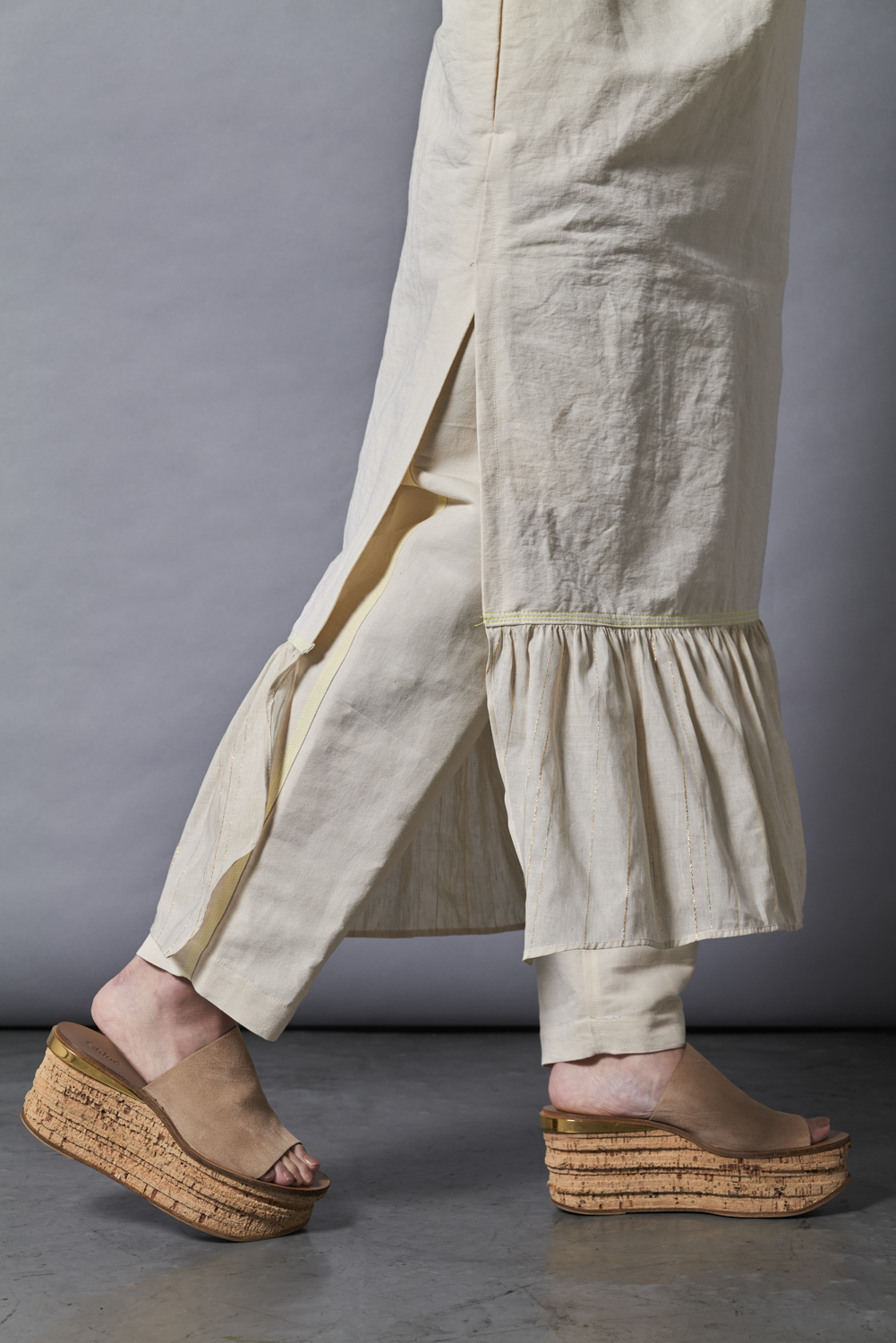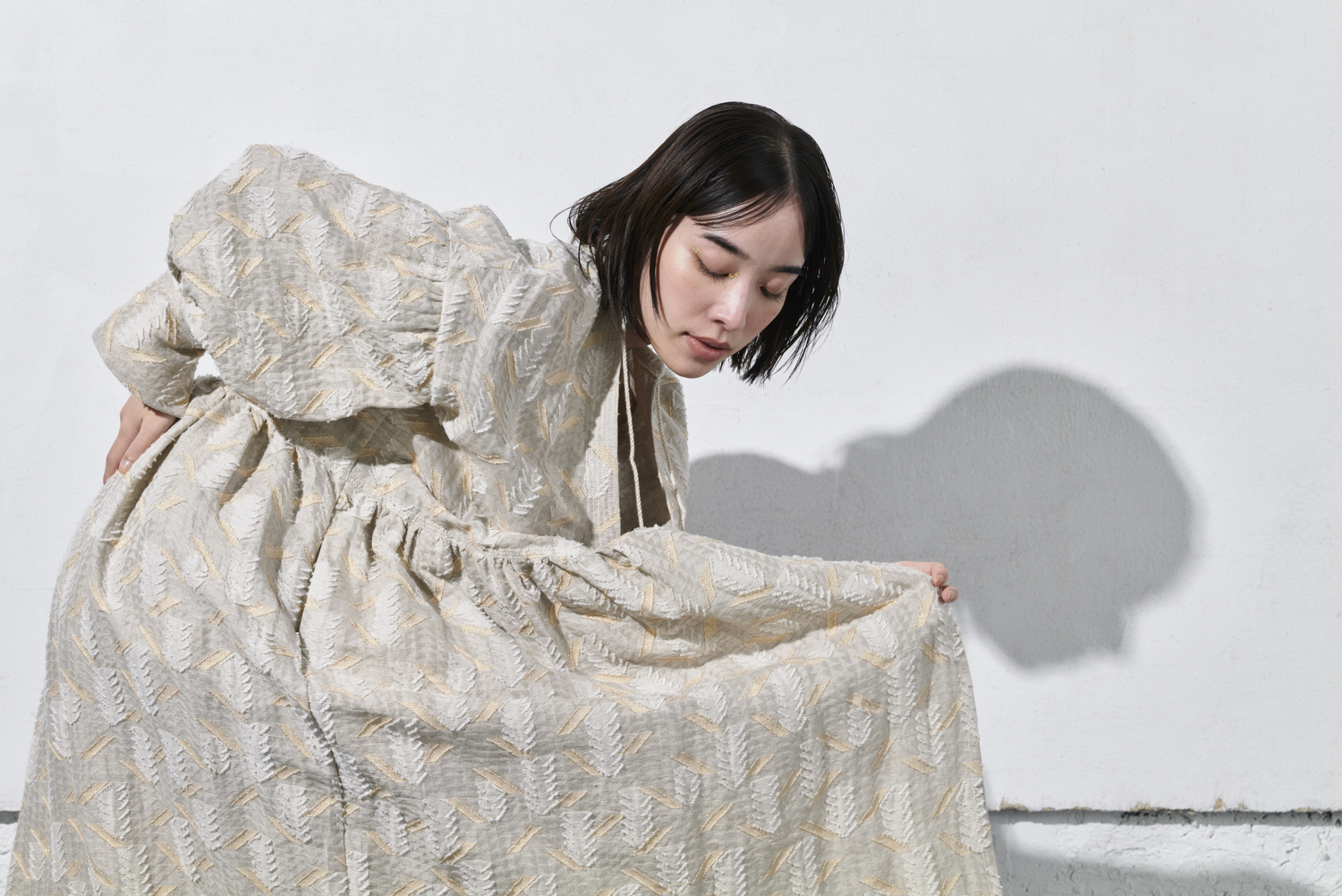 天然素材をベースにラメ糸を織り込んだ華やかなカットジャカード生地で作るワンピースや、オリジナルの真鍮ボタンをつけたブラウスなど、細部にまでこだわり丁寧に制作した衣服をお持ちします。