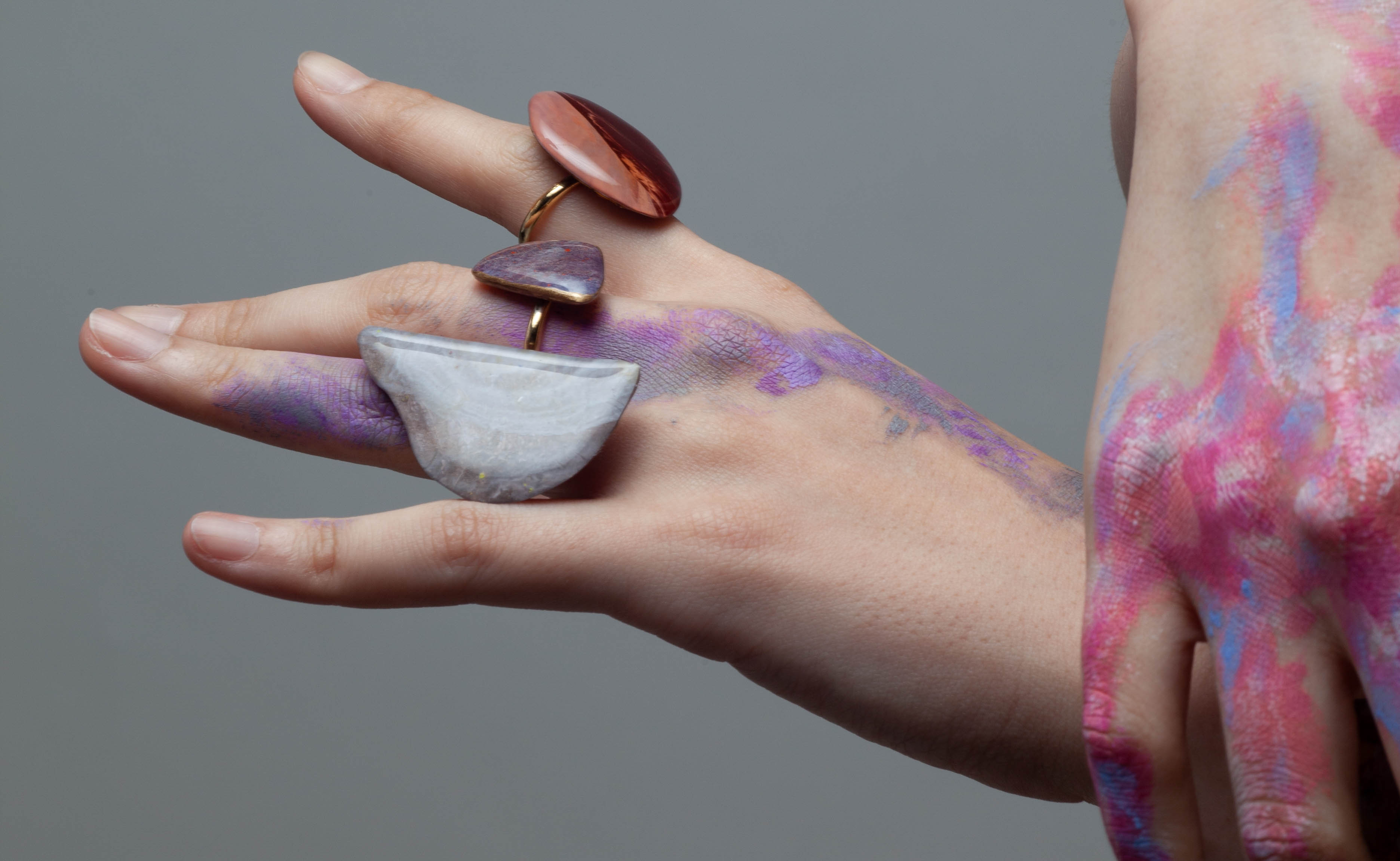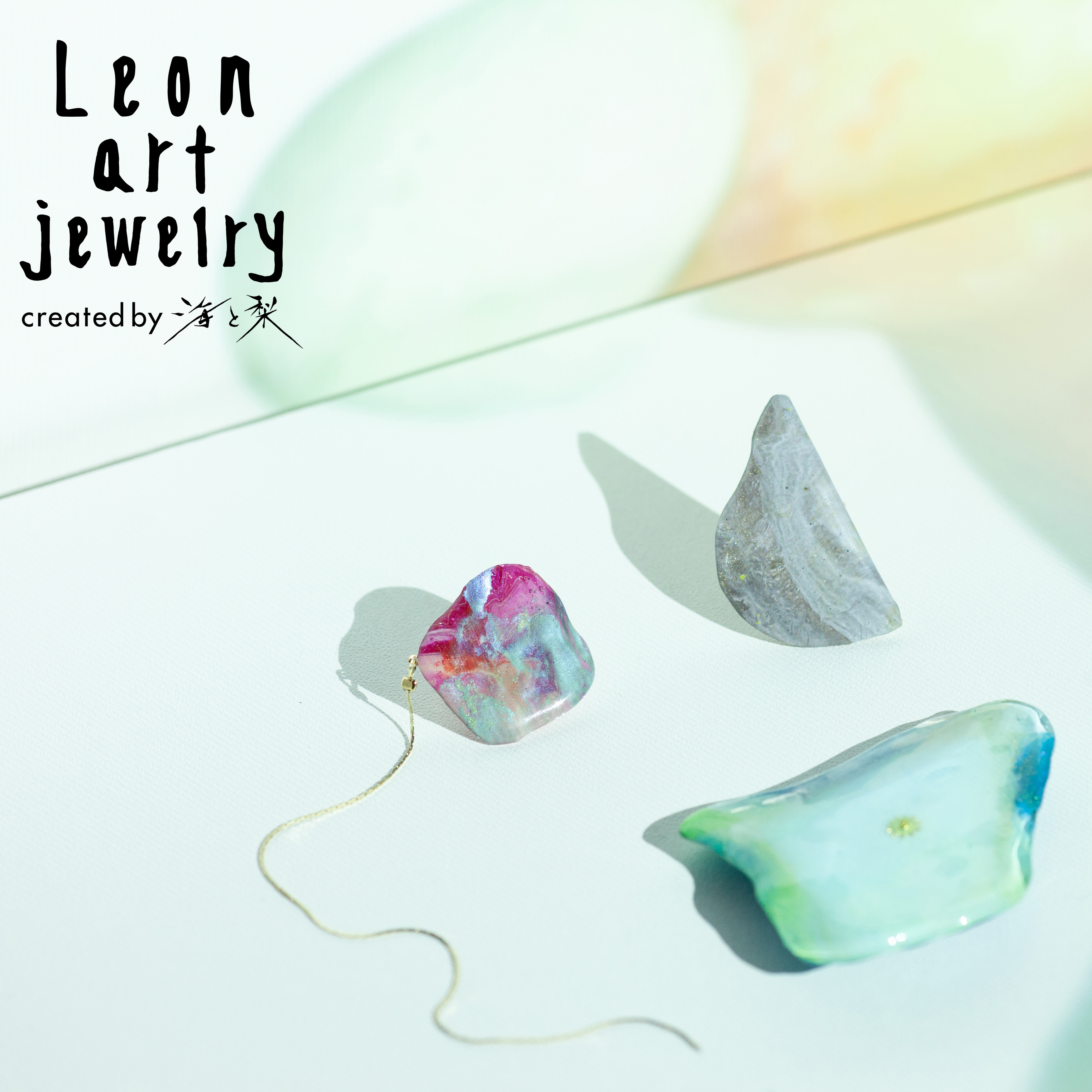Leon art jewelryは、アートユニット海と梨によるアート作品「スターダスト・ペインティング」を用いて制作されています。肌を輝かせ個性を引き立てるように構成された色彩バランスこそ私達の技術と経験が詰め込まれています。デザイナーの二人は画家で、アクセサリーの展示に加えて絵画の展示やライブペイントなどの活動も行なっています。色彩の宇宙から貴方だけの輝きを見つけてくだい。