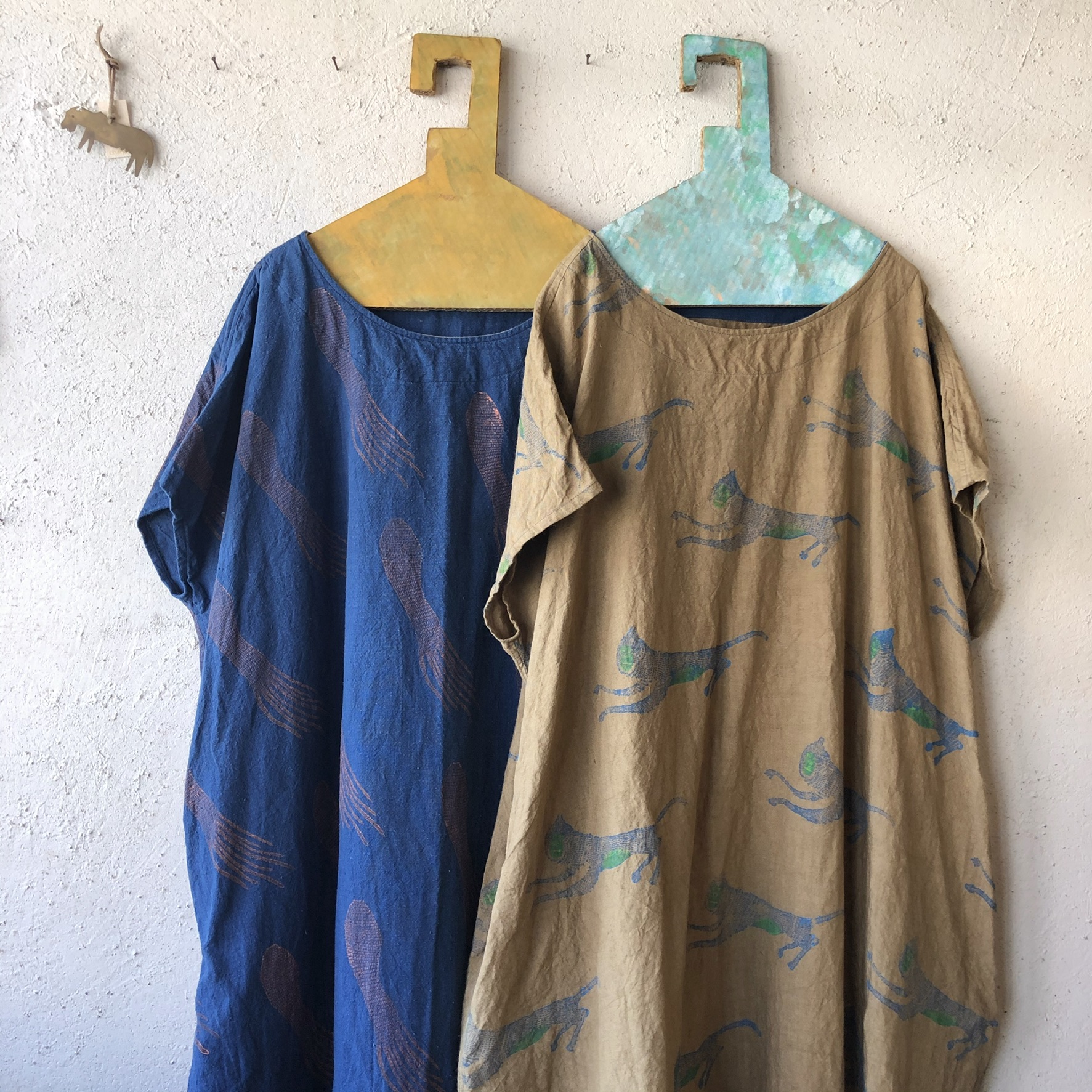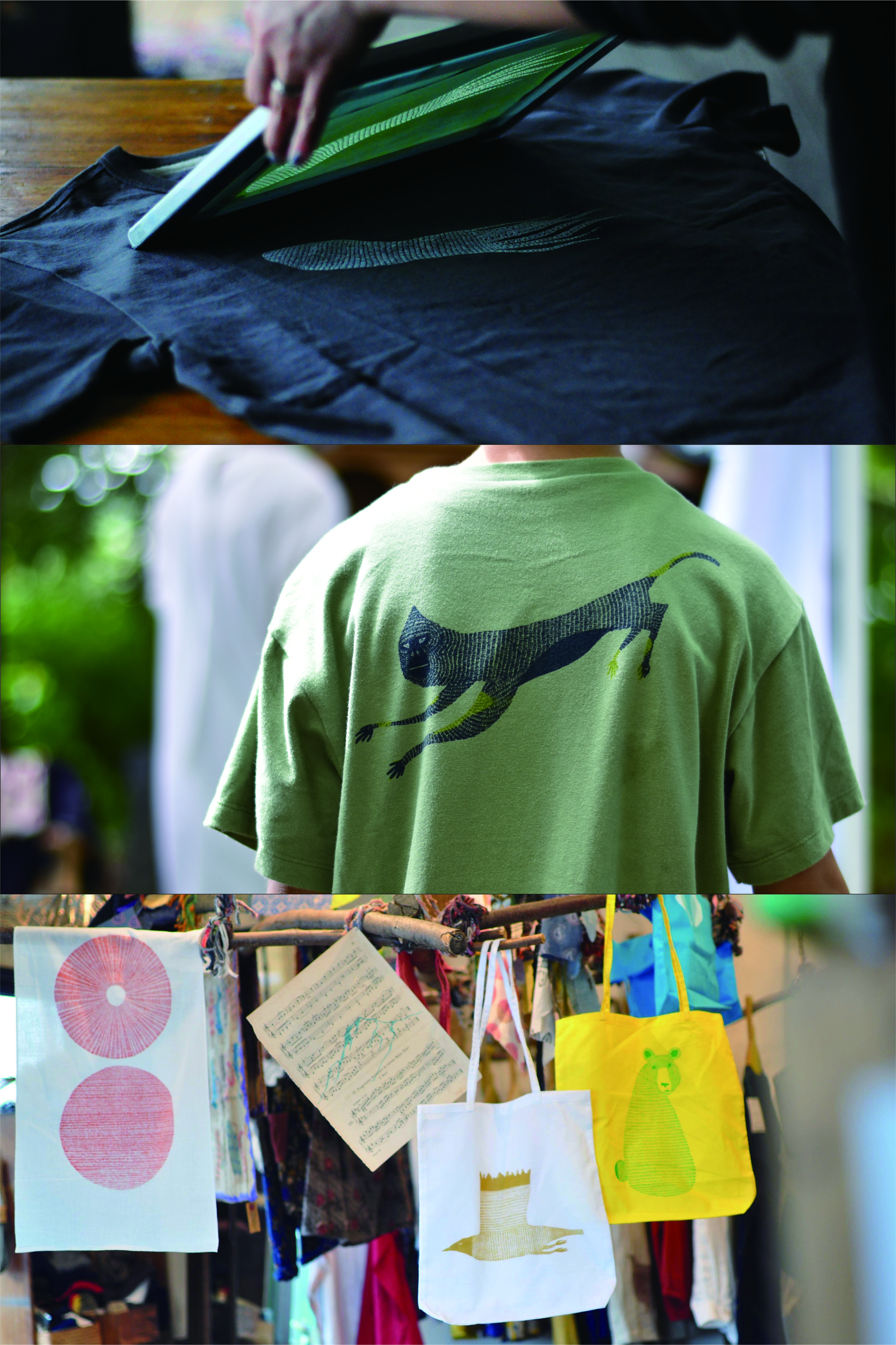 オリジナルイラストの動物たちをTシャツやトートバッグにシルクスクリーンでプリントするワークショップと、シャツやワンピやエプロン、手ぬぐいなどの販売を予定しています。