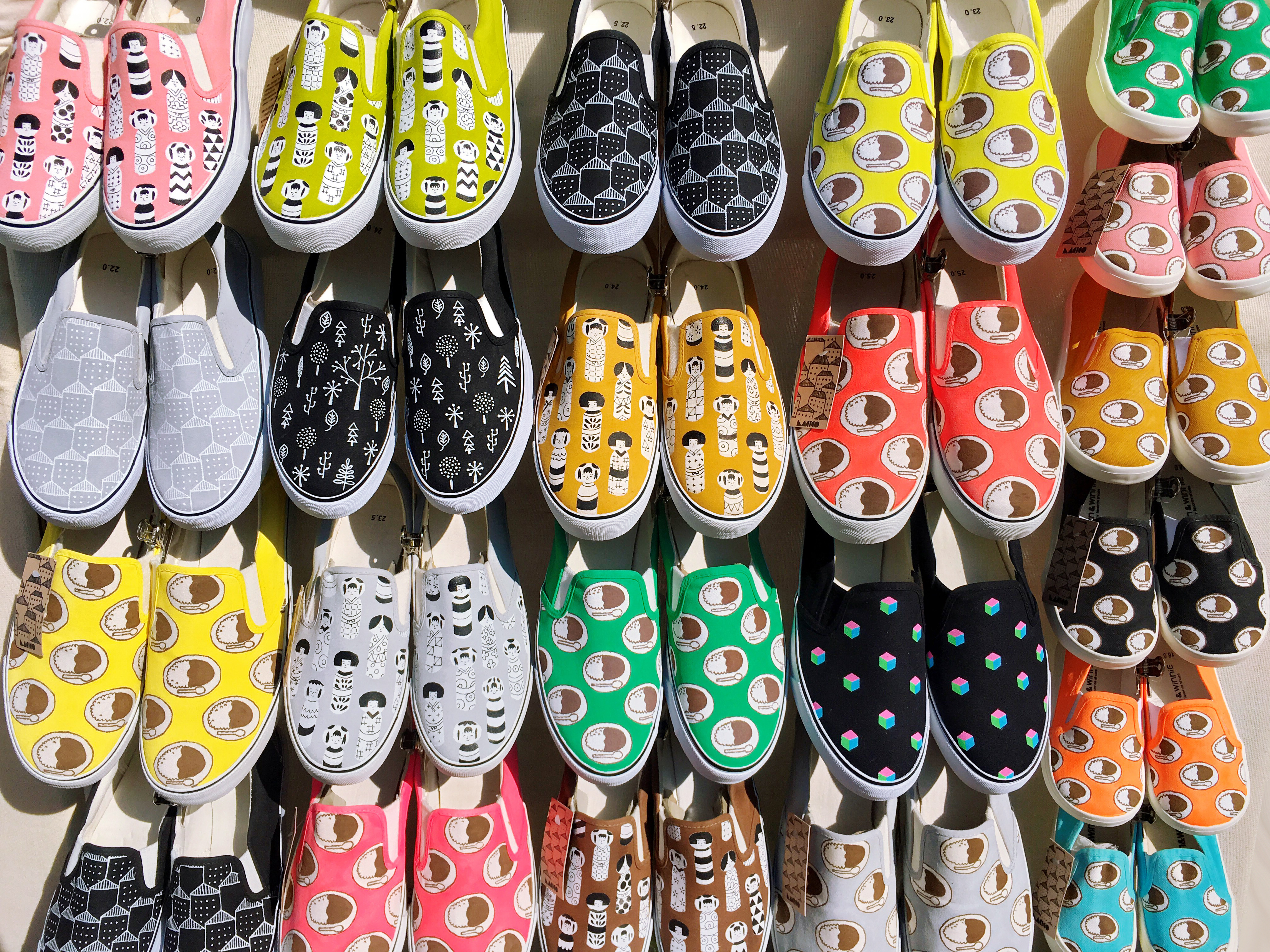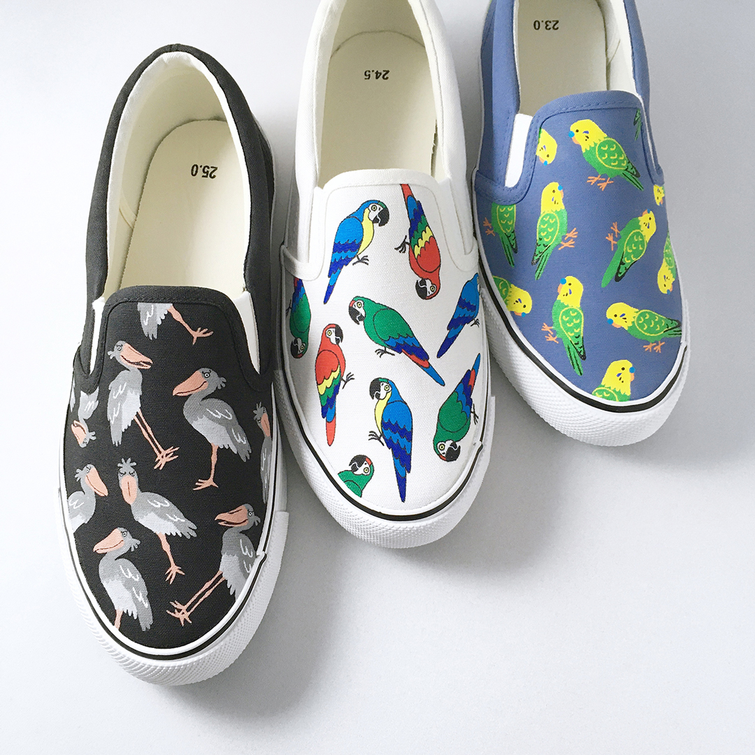 「 日々の暮らし 」をテーマに一足ずつ手描きしたオリジナル柄スリッポンを製作。