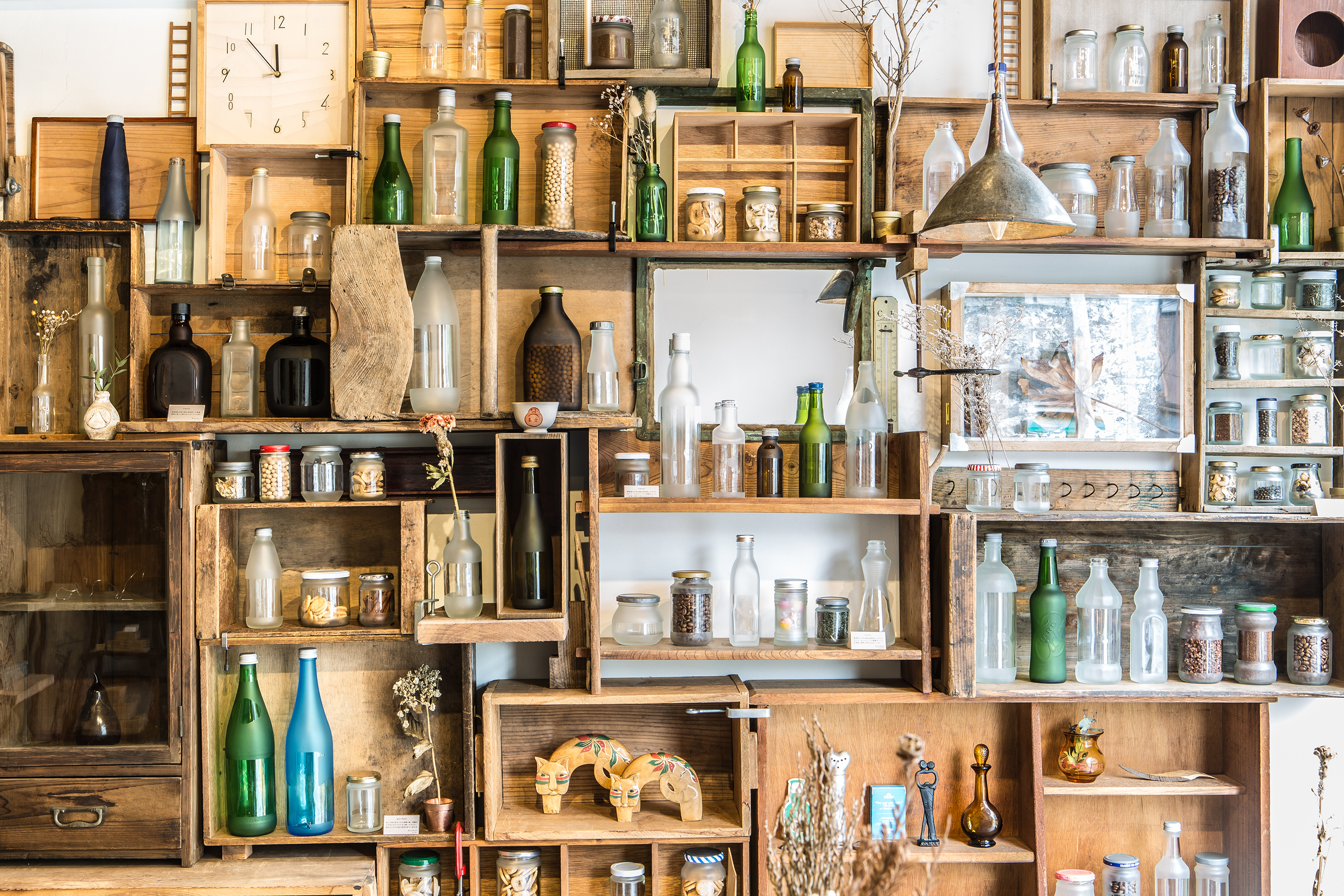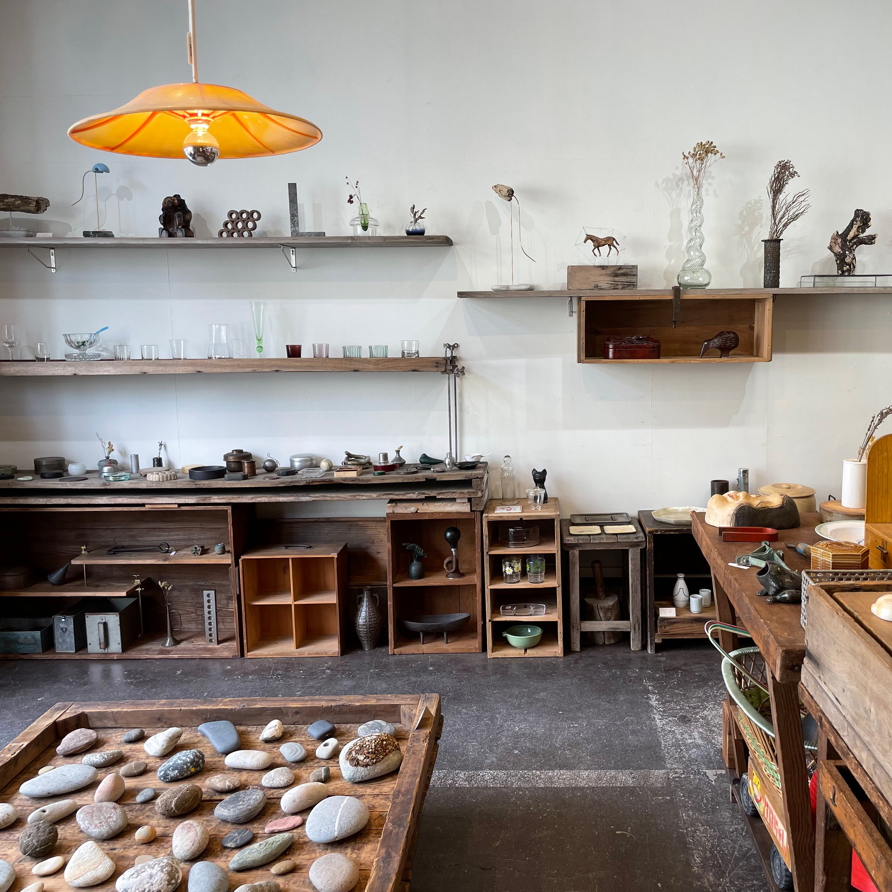 作者や年代など情報的な市場価値を排除し、店主の主体的嗜好に沿って集められた古物や抽象物、漂着物など時間と環境に研磨された多様な造形物と、それらを用いて製作されたユニークコレクションを販売しています。