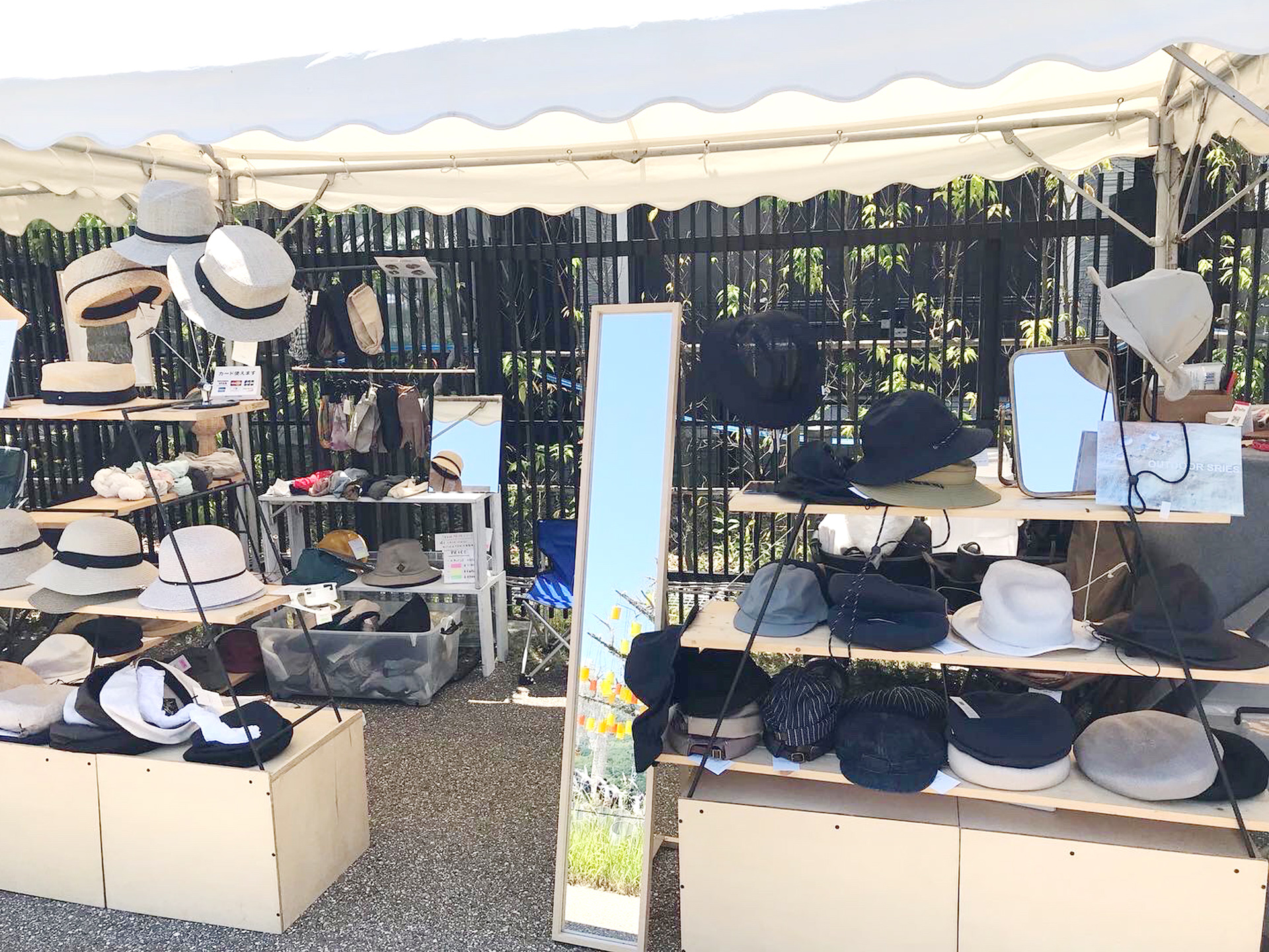 アウトドア向けの全天候型のハットやキャップ。美濃和紙や天然素材で作ったストローハットなど持ち込む予定です。