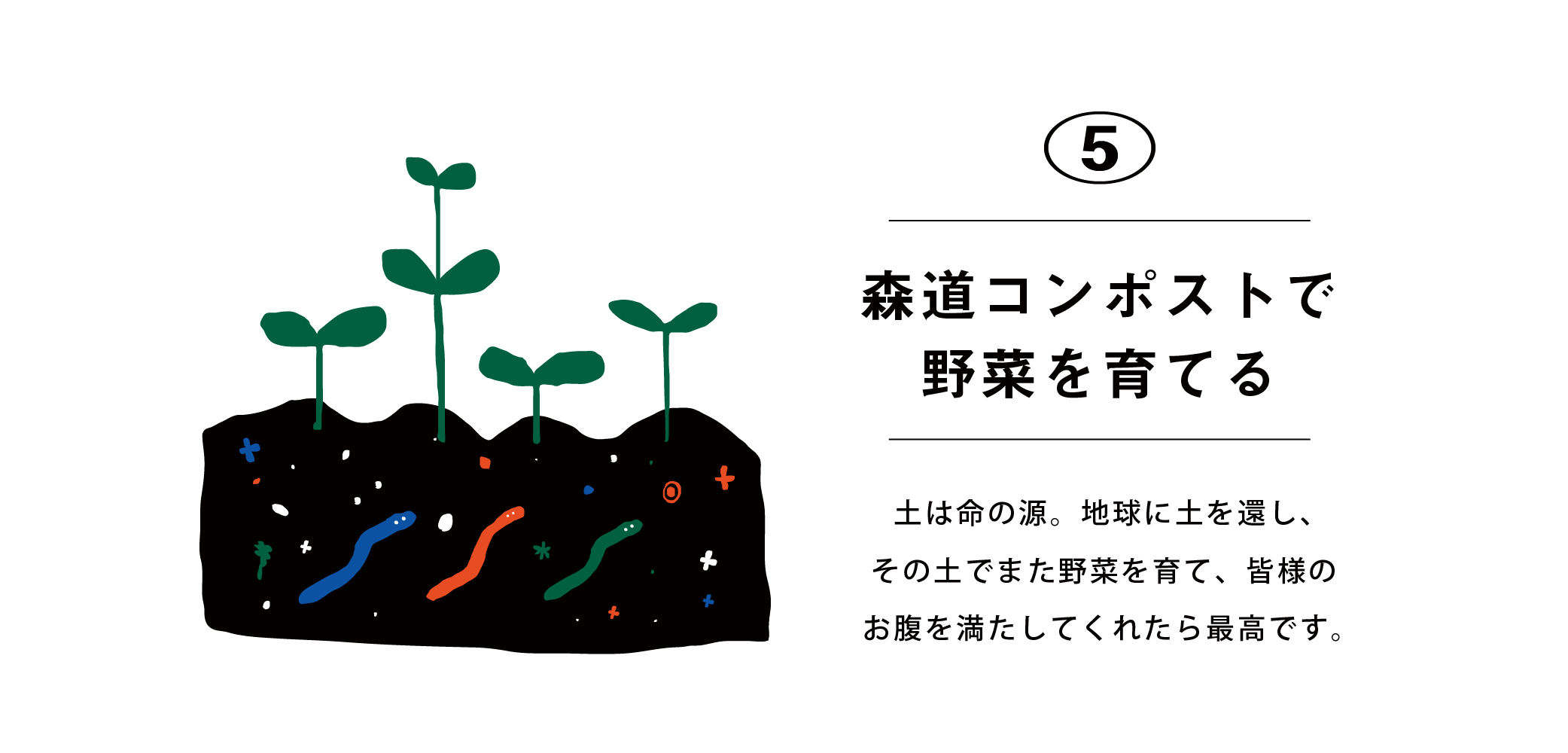 森、道、市場で出た生GOMIが、土になって還ってきて、その土で野菜を育て、その野菜を食べて、また私の身体に還すことができれば最高に楽しい。
