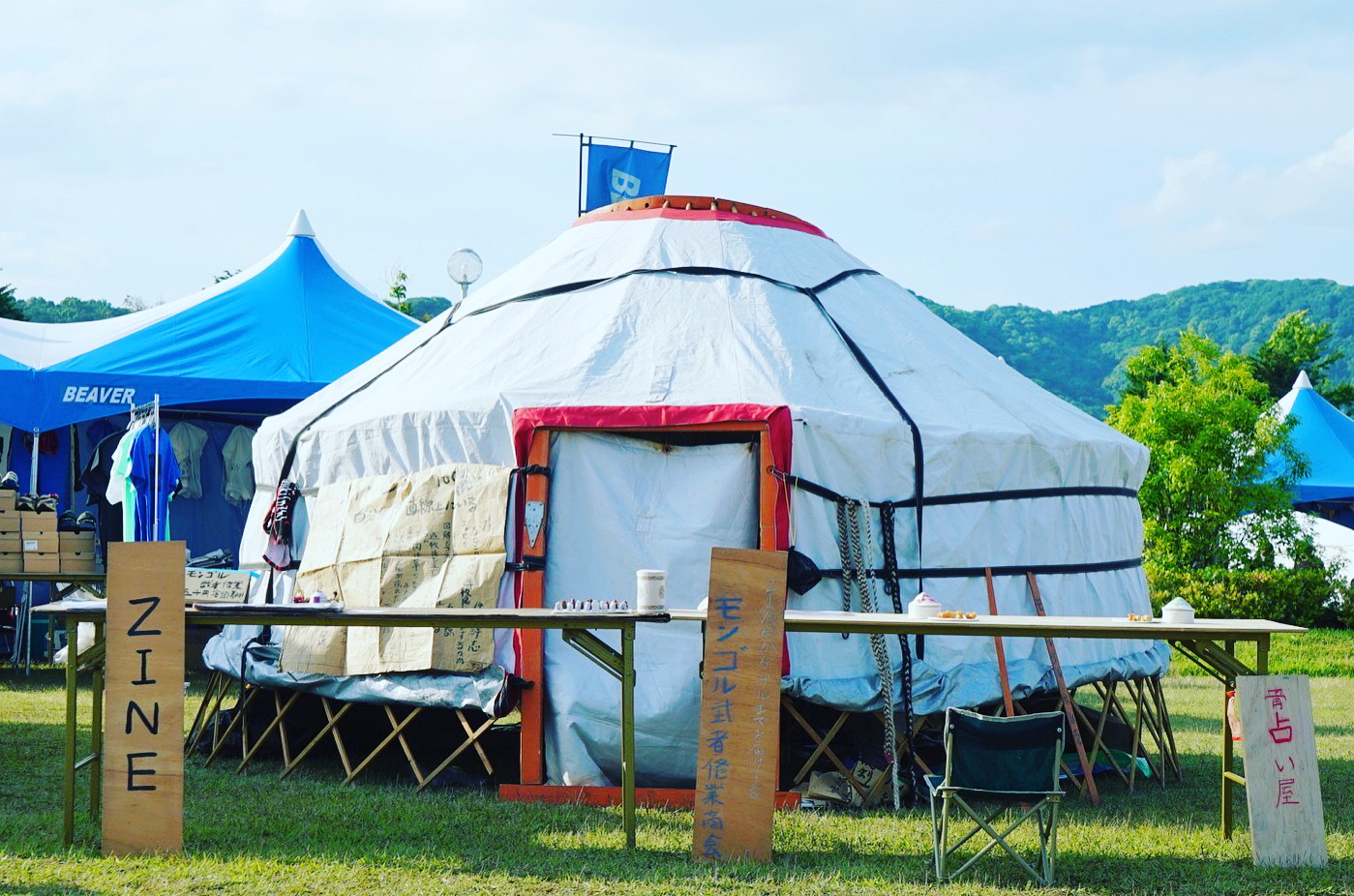 遊牧民に弟子入りする「モンゴル武者修行」と山岳民アカ族に弟子入りする「タイ武者修行」の参加者有志による商店です。各者普段はバラバラに活動していますが、この日だけ全国から集結します。店はモンゴルの移動式住居のゲルが目標で、タイチームは、その場で竹をナタで削ってコップを製造しています。ゲルは最新型ですので中身もぜひご覧いただきたく建築します。市場ですから、普段遭遇しない未知なるものをお見せしたいという意気込みで出店します。 実店舗が出るのは今のところ森道市場だけ!