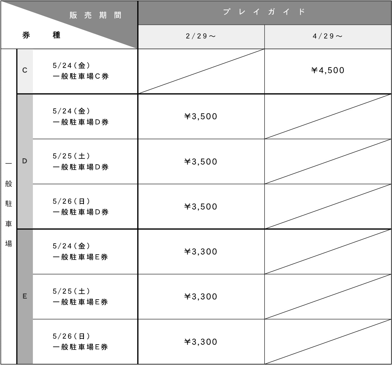 チケットの料金一覧 入場券各種 ・子ども(小中学生)有料 / 要保護者同伴 ・未就学児無料 / 要保護者同伴 駐車場券各種 一般駐車場 臨時駐車場 キャンプサイト券各種 デイキャンプサイト区画券各種 VIP ZONE区画券各種