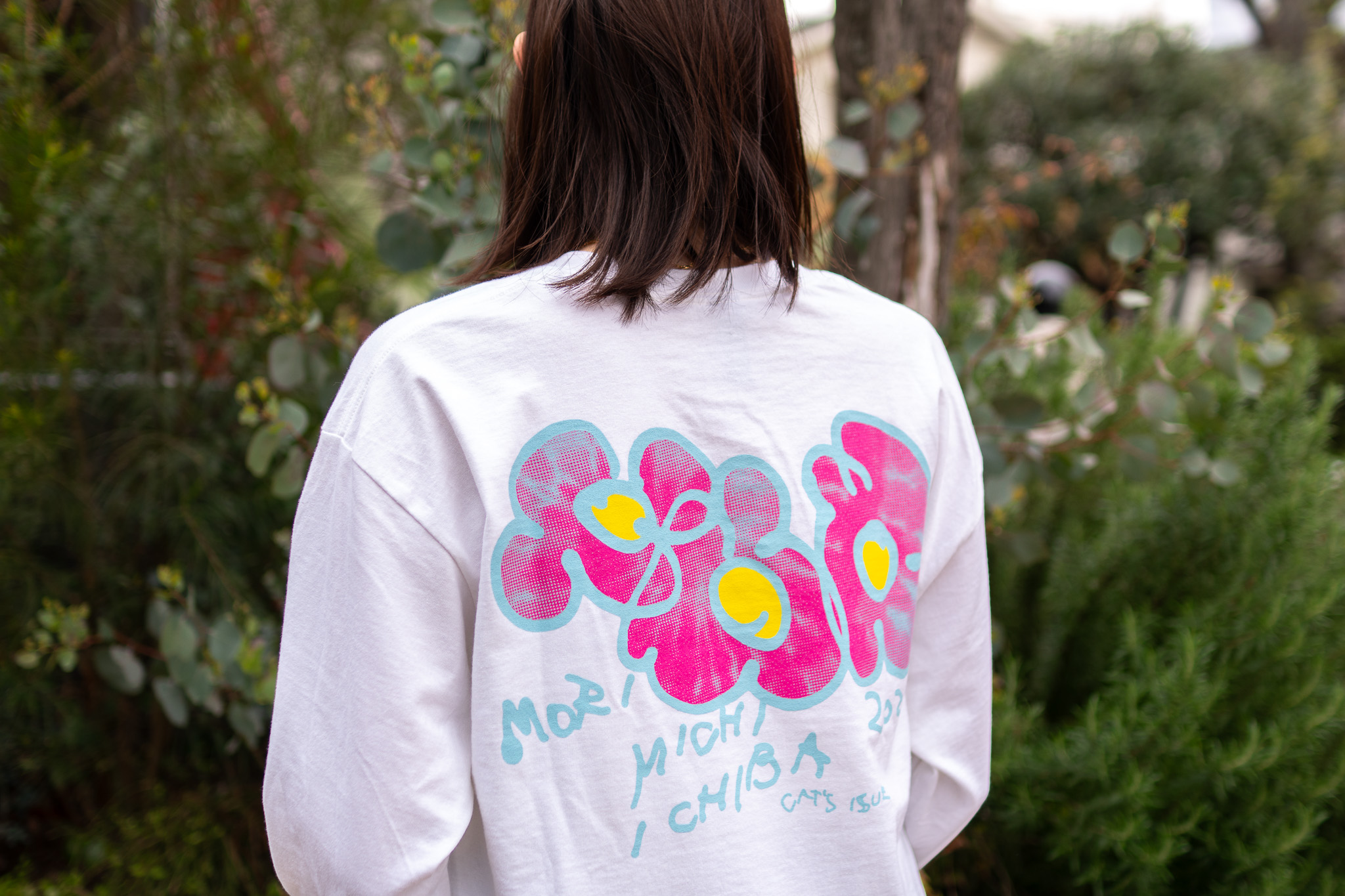 花と、タイダイ柄、そして緒方数馬による目隠しで描くアート。3つを掛け合わせ、これまでのどのTシャツとも違う、大胆なグラフィックが完成しました。