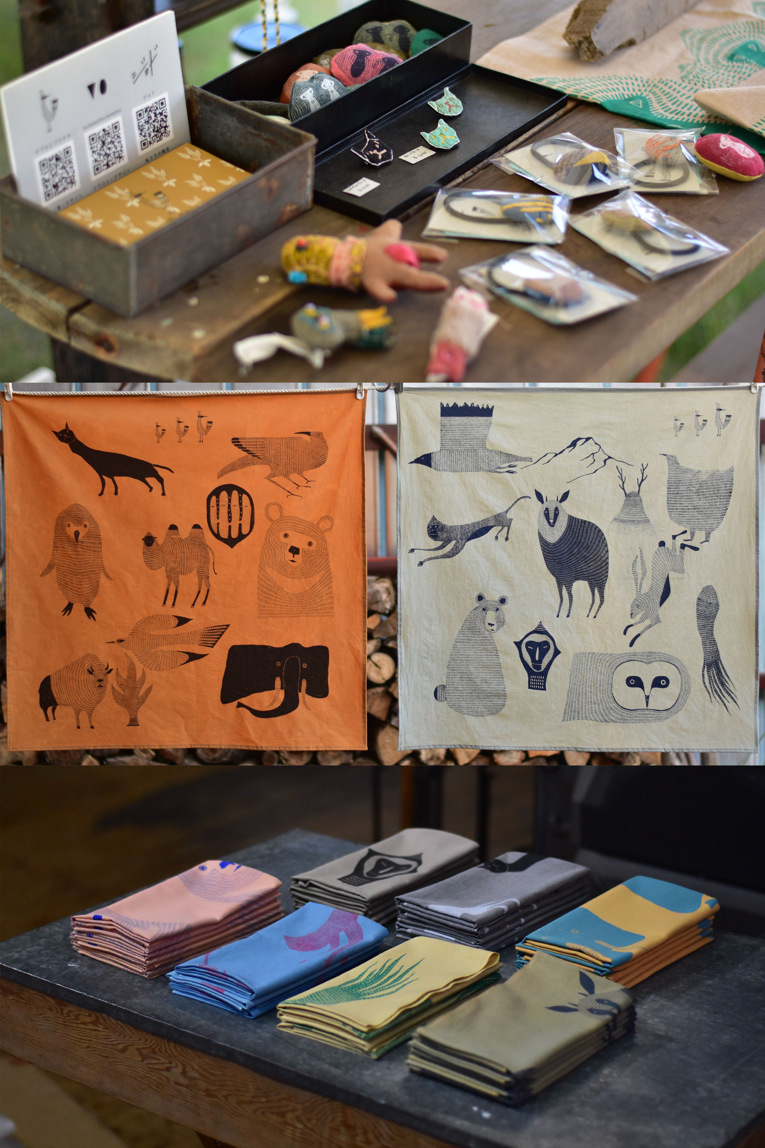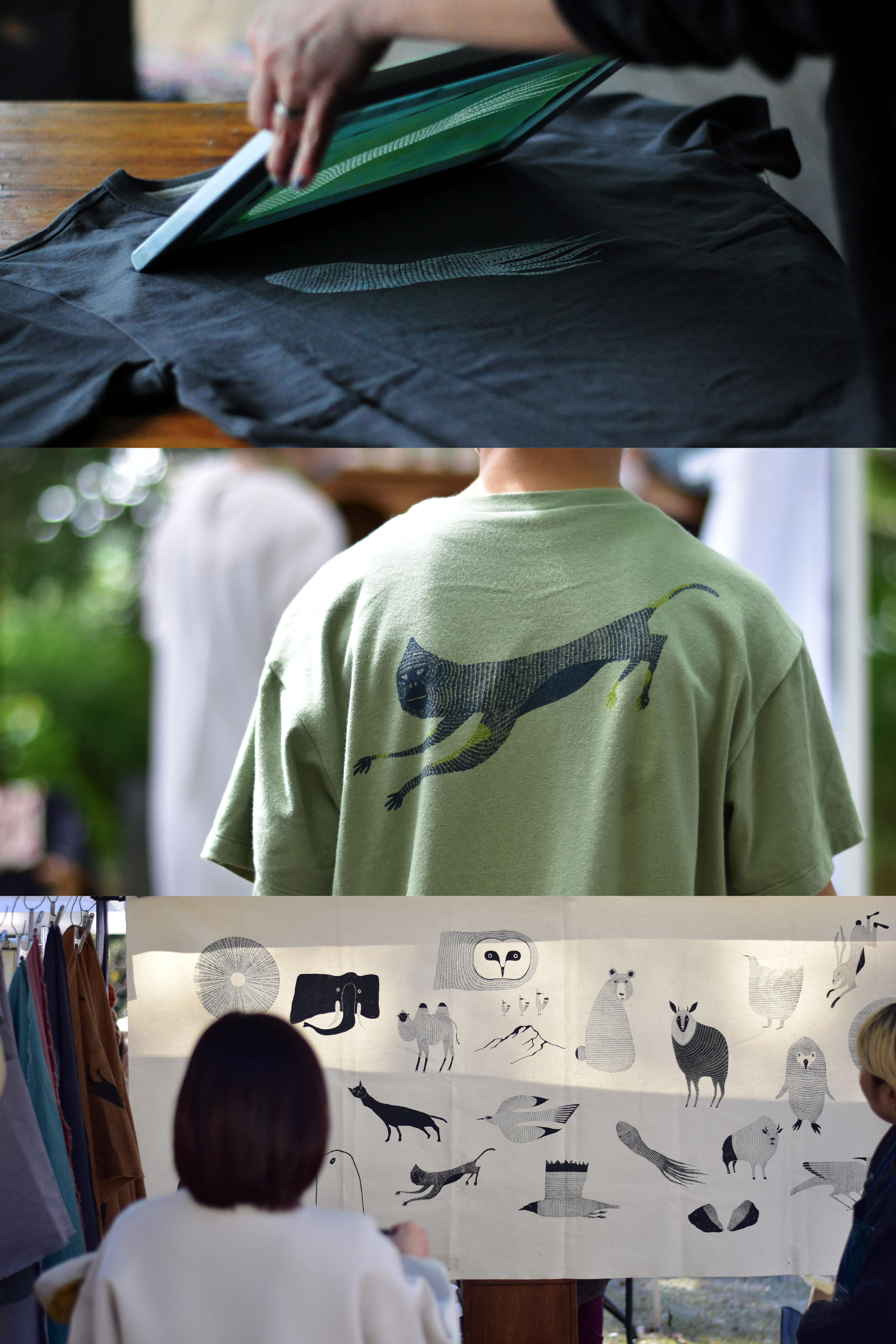 オリジナルイラストの動物たちをTシャツやトートバッグにシルクスクリーンでプリントするワークショップと、ワンピやパンツなどの洋服、手ぬぐいや風呂敷などの販売を予定しています。 シルクスクリーンのプリントは、ベースのTシャツとトートバッグをご用意しますが、持ち込みも大歓迎です。 一緒にキャッキャしながらプリントしましょうー!