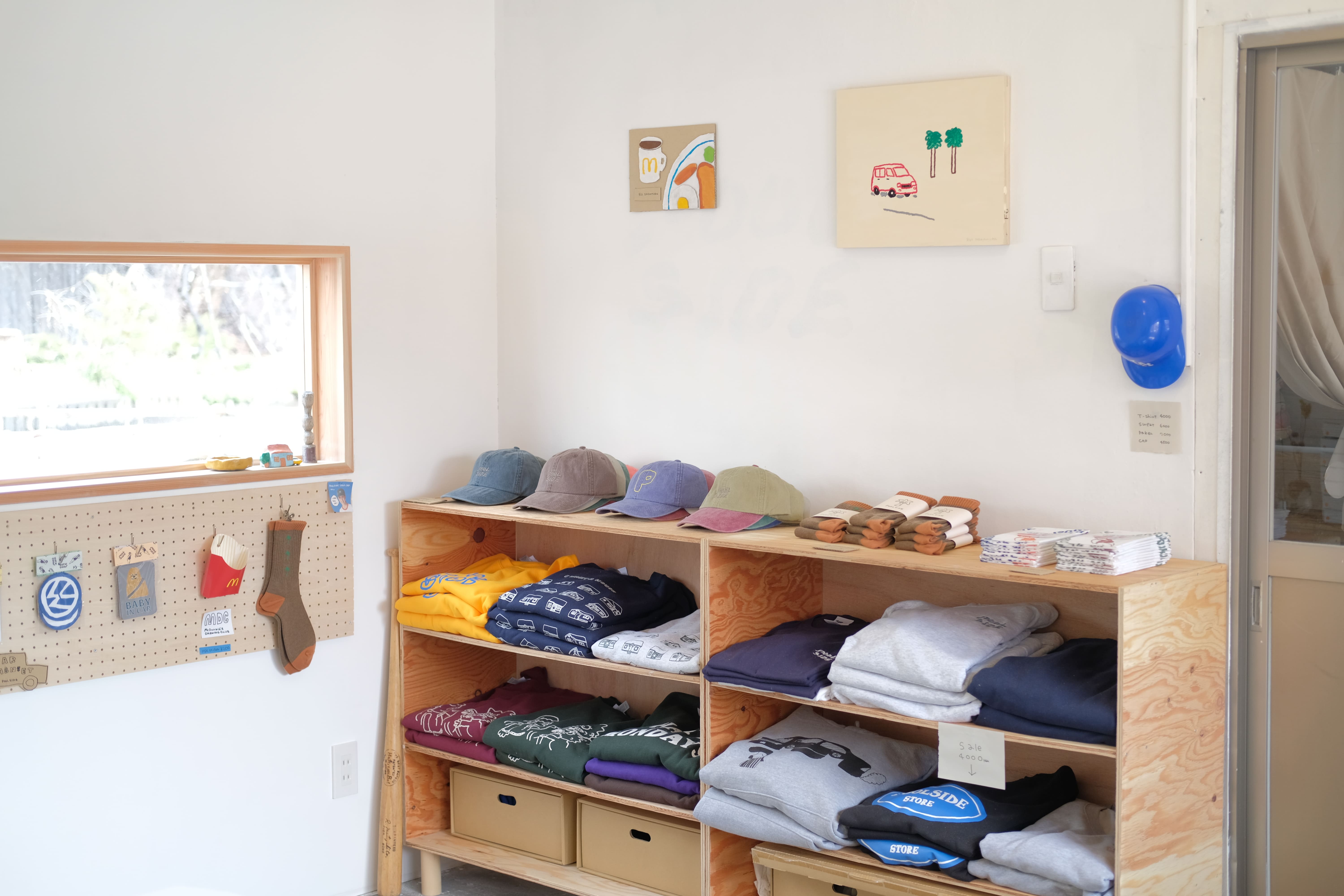 イラストレーションを落とし込んだTシャツやキャップなどから、ステッカーや手ぬぐいなど様々なグッズが並びます🌐 ナカムラルイによる似顔絵も行います!