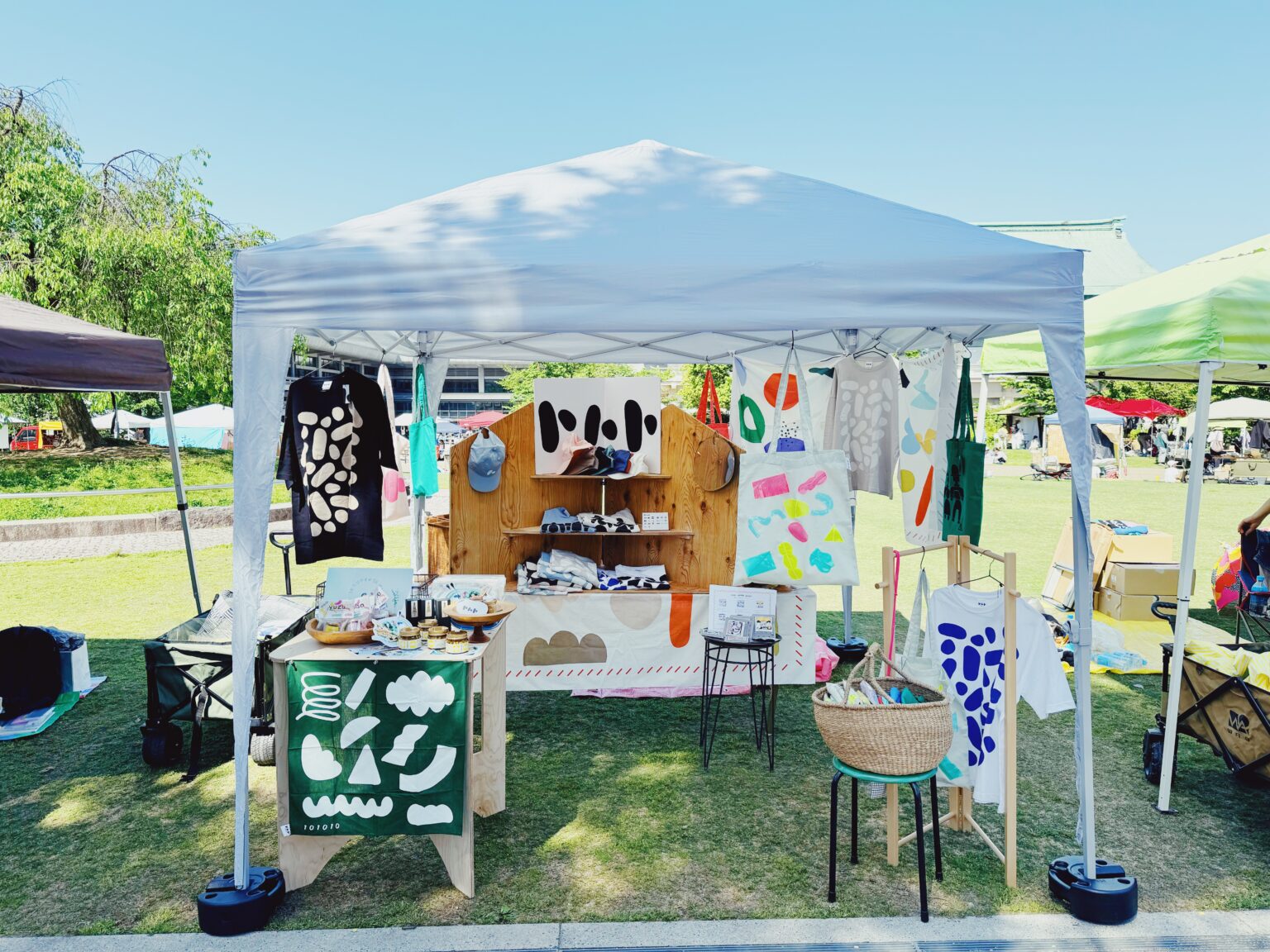 オリジナルグローサリーをはじめ、101010のモチーフになっている石ころをデザインしたアパレルアイテムや、オリジナルファブリック、Tシャツや、ブラウスやパンツなどのアパレルアイテム、トートバッグなど。またキッズTも少し作りました。さらに101010 RADIOに出演していただいた方々の商品やグッズも持っていきます。