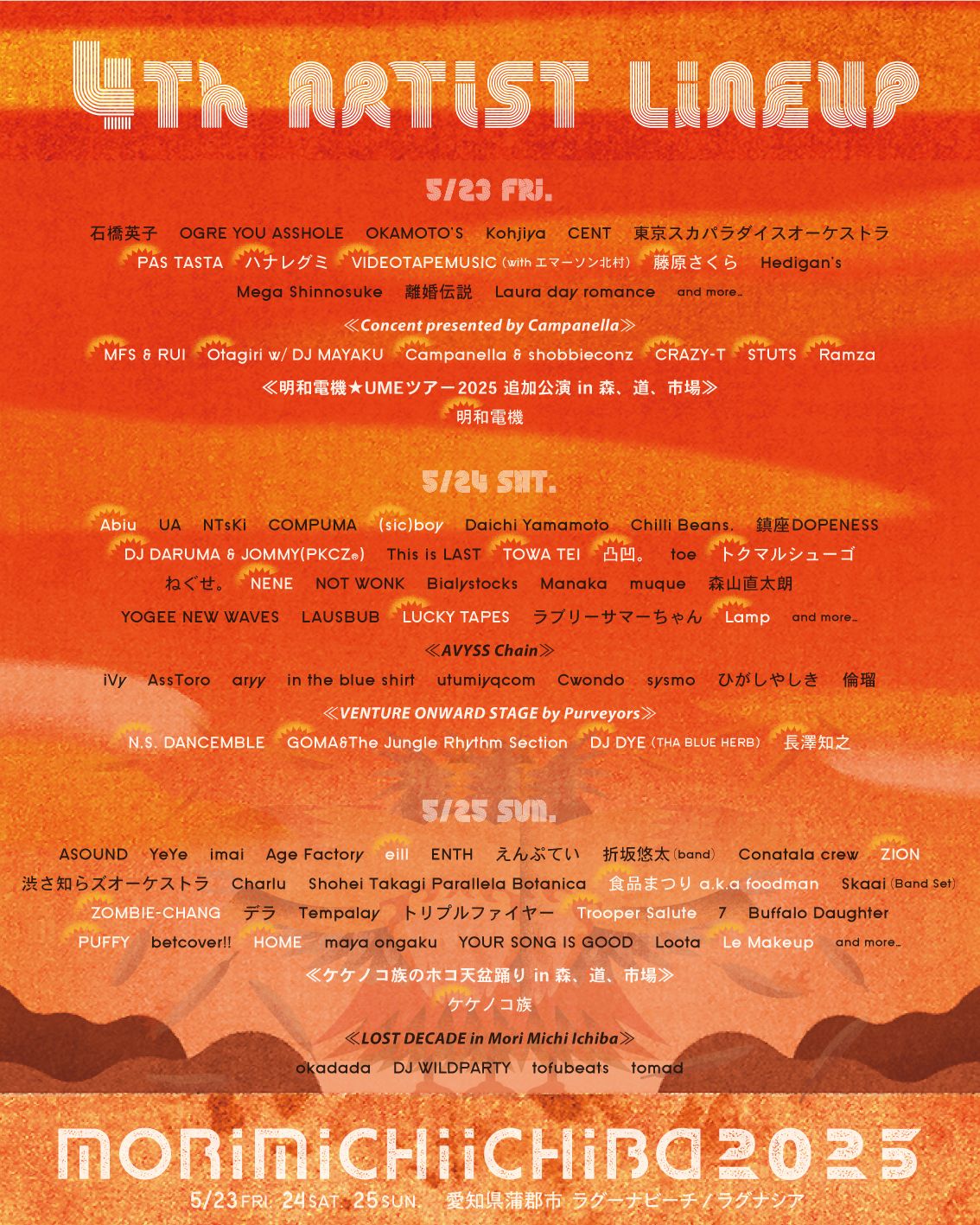 ASOUND / YeYe / imai / Age Factory / eill / ENTH / えんぷてい / 折坂悠太(band) / Conatala crew / ZION / 渋さ知らズオーケストラ / Charlu / Shohei Takagi Parallela Botanica / 食品まつり a.k.a foodman / Skaai(Band Set) / ZOMBIE-CHANG / デラ / Tempalay / トリプルファイヤー / Trooper Salute / 7 / Buffalo Daughter / PUFFY / betcover!! / HOME / maya ongaku / YOUR SONG IS GOOD / Loota / Le Makeup / and more…