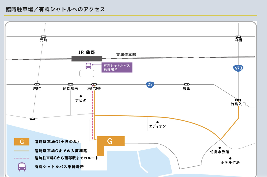 ※有料シャトルバスをご利用のお客さまは乗車券発売所 (蒲郡駅南口のりば付近)で乗車券をお買い求めください。