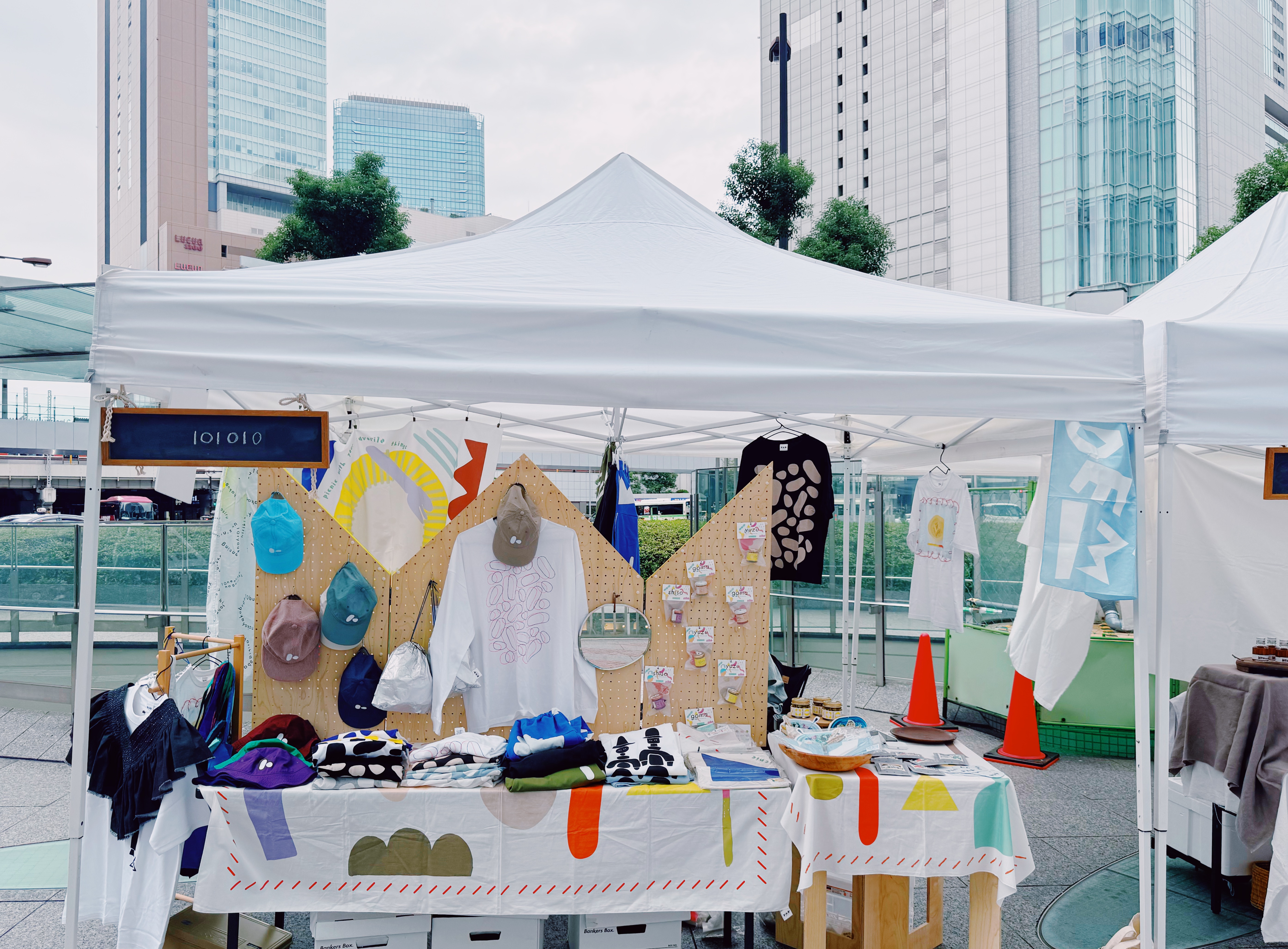 オリジナルグローサリーをはじめ、101010のモチーフになっている石ころをデザインしたアパレルアイテムや、オリジナルファブリック、Tシャツや、ブラウスやパンツなどのアパレルアイテム、トートバッグなど。またキッズTも少し作りました。さらに101010 RADIOに出演していただいた方々の商品やグッズも持っていきます。
